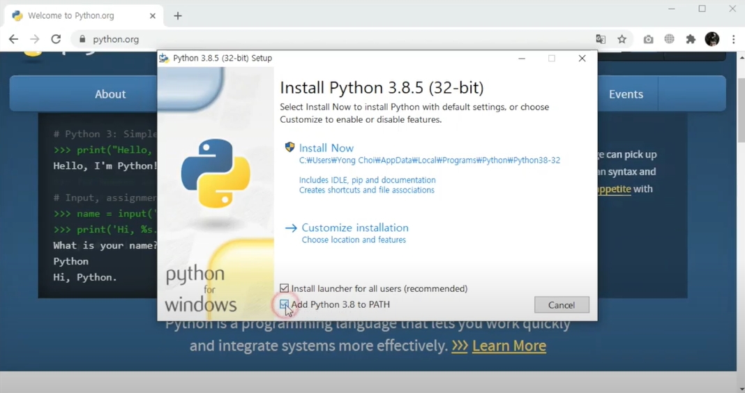 "Add Python 3.8 to PATH" Path 에 경로를 추가하게 되면 어떤 폴더에서든 파이썬을 구동 시킬 수 있기 때문에 체크를 합니다.