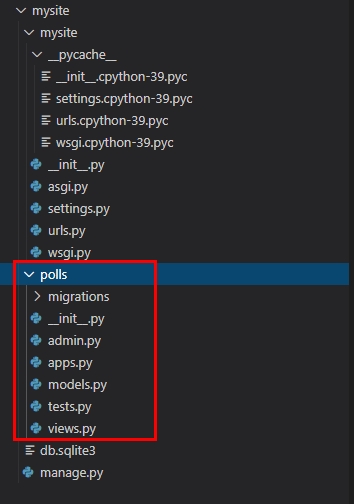 "py manage.py startapp polls" 엔터 -> polls라는 앱을 만듭니다. (예제 : 투표 담당)
