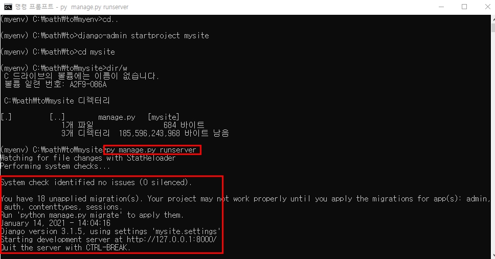 이 테스트를 하기 위해 프로젝트의 가상 환경이 활성화 되어 있어야 합니다. (activate.bat)