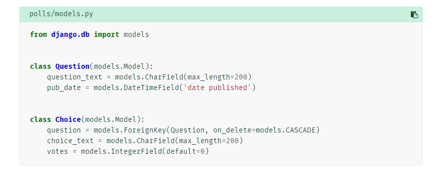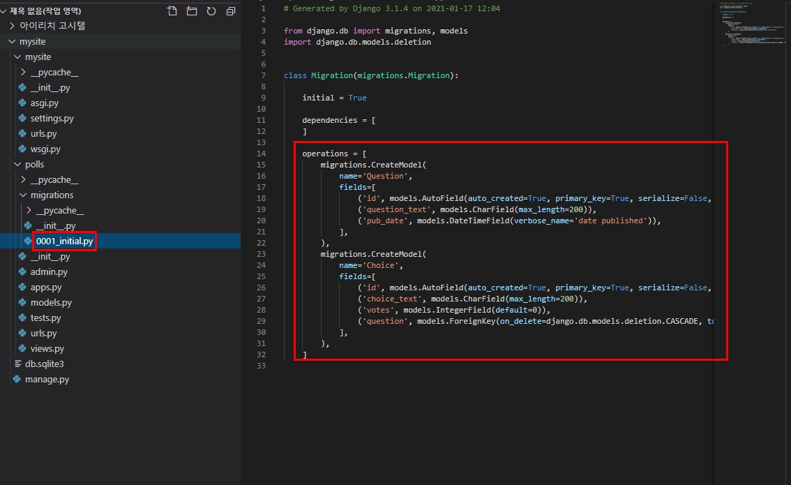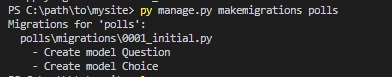 "py manage.py makemigrations polls" -> 데이타베이스에 작성한 테이블을 만들어지도록 설정