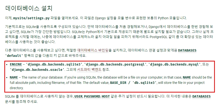 엔진 : 'django.db.backends.sqlite3', 'django.db.backends.postgresql', 'django.db.backends.mysql', 'django.db.backends.oracle'