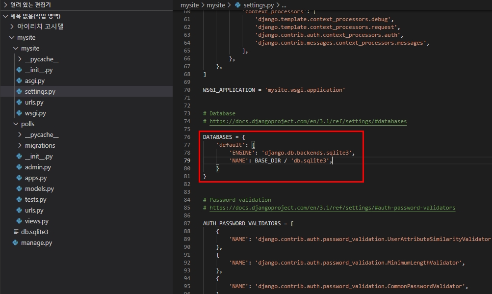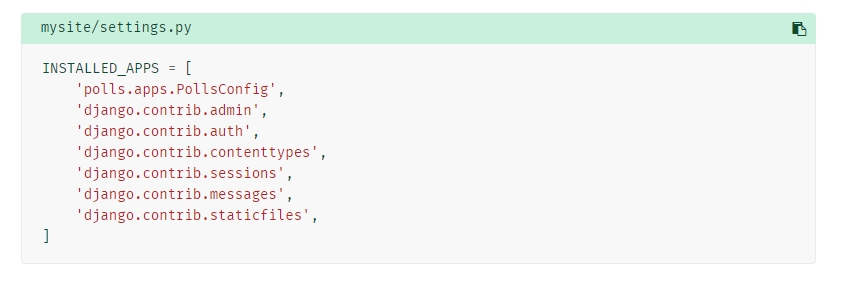 "mysite/settings.py" 에 'polls.apps.PollsConfig' 추가하기